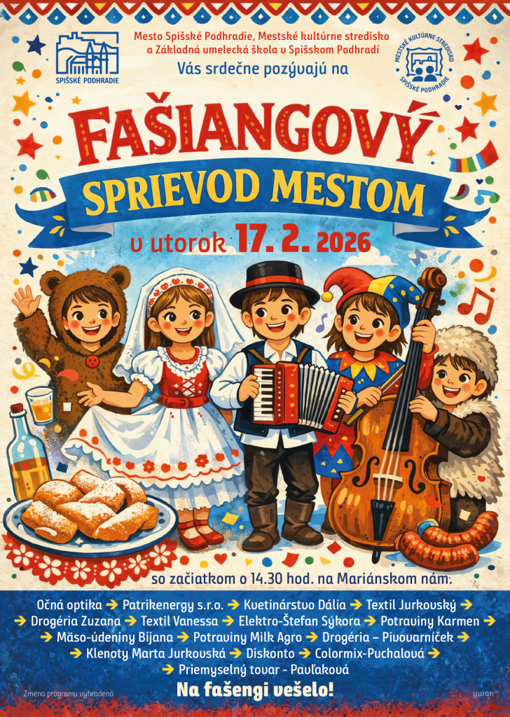 "NA FAŠENGY VEŠELO"! Srdečne Vás pozývame na FAŠIANGOVÝ SPRIEVOD MESTOM, ktorý sa uskutoční 17.2.2026 so začiatkom o 14:30 hod. na Mariánskom námestí pred Mestským úradom. Bližšie informácie sú uvedené na plagáte. Tešíme sa na Vás.