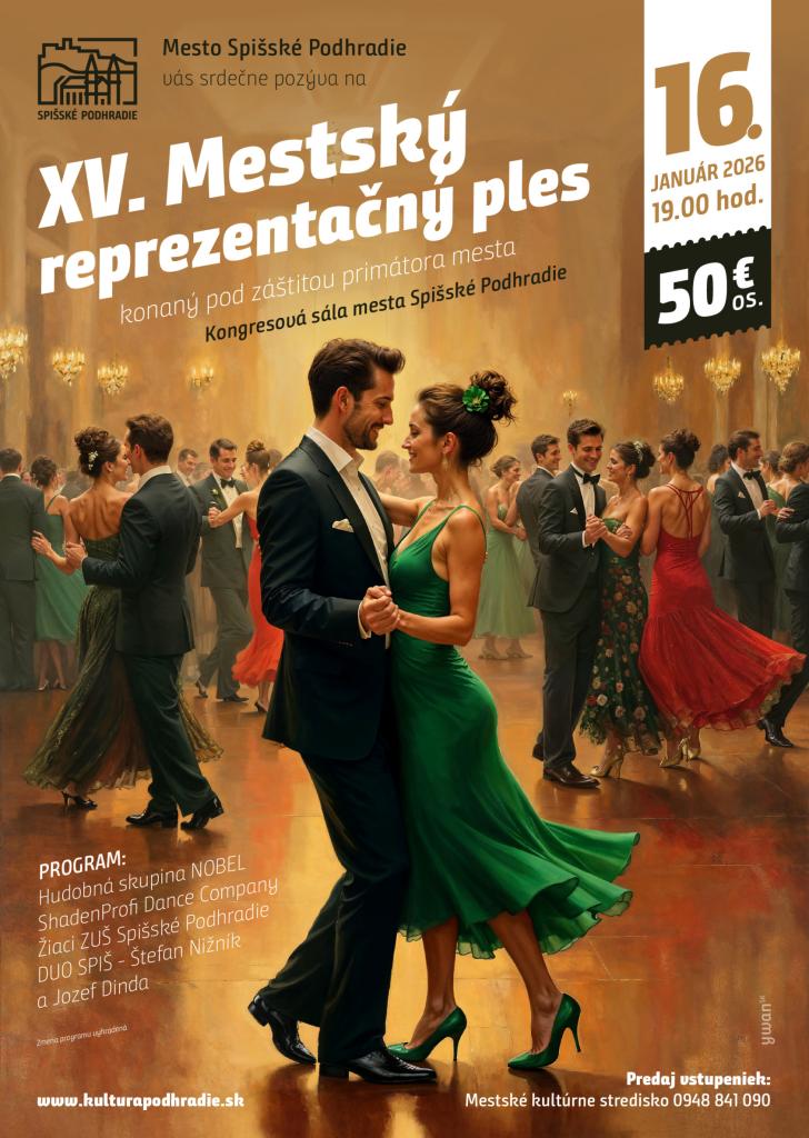 Srdečne Vás pozývame na "MESTSKÝ REPREZENTAČNÝ PLES" konaný pod záštitou primátora mesta, ktorý sa uskutoční 16.01.2026 v Kongresovej sále mesta Spišské Podhradie.
