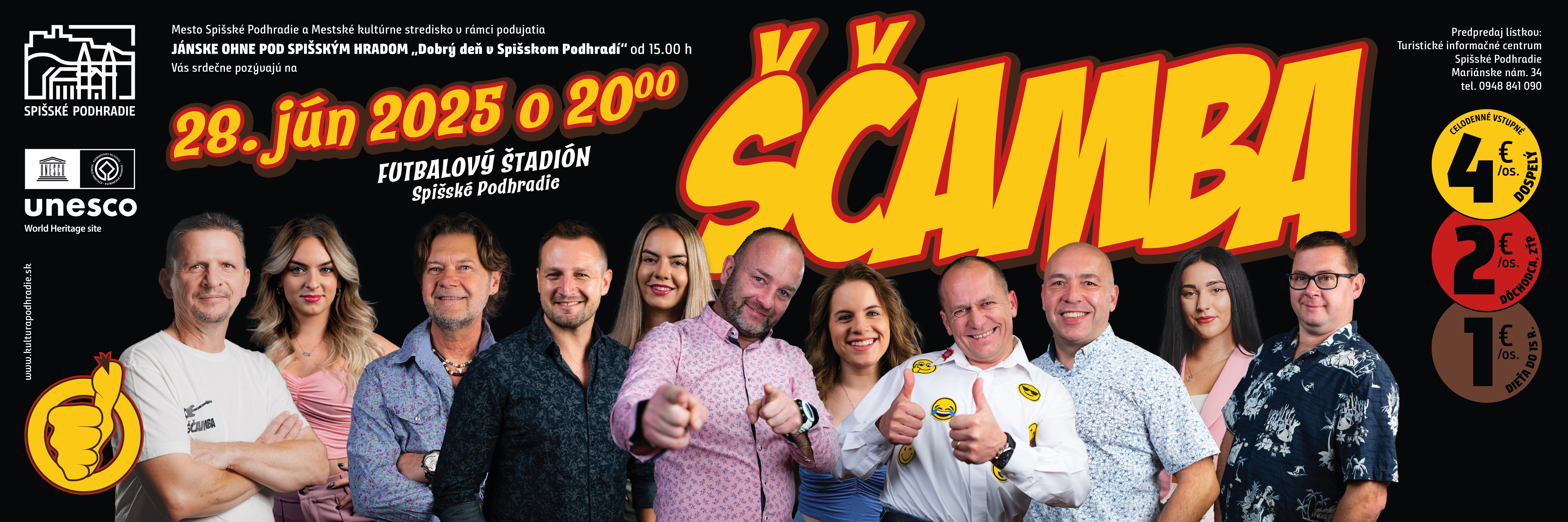 Nenechajte si ujsť koncertné vystúpenie hudobno-zábavnej kapely ŠČAMBA, ktorá sa vám predstaví v rámci podujatia JÁNSKE OHNE POD SPIŠSKÝM HRADOM dňa 28. júna 2025.