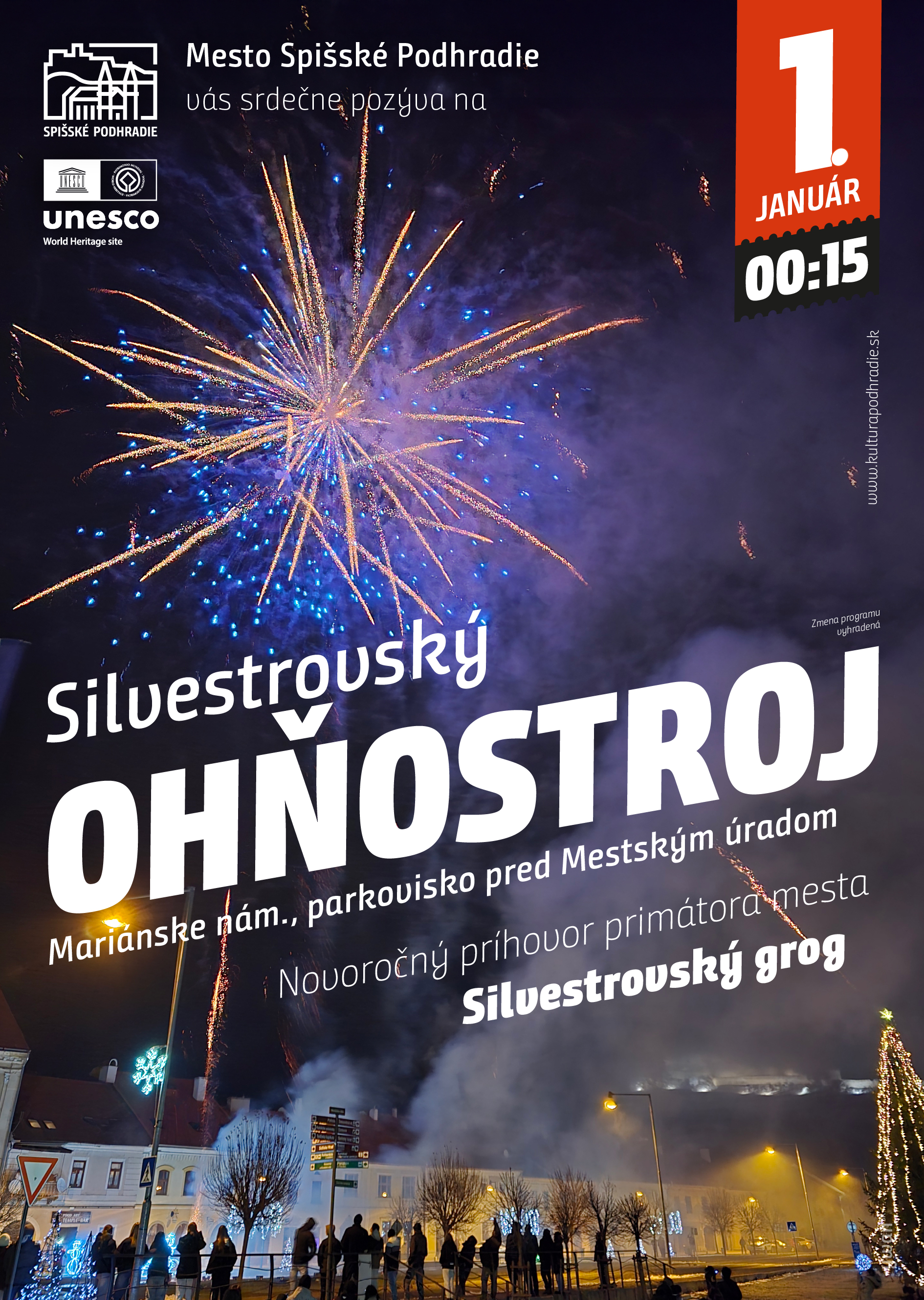 Srdečne Vás pozývame na SILVESTROVSKÝ OHŇOSTROJ, ktorý sa uskutoční 01.01.2026 o 00:15 na Mariánskom námestí v Spišskom Podhradí. Bližšie informácie sú uvedené na plagáte.