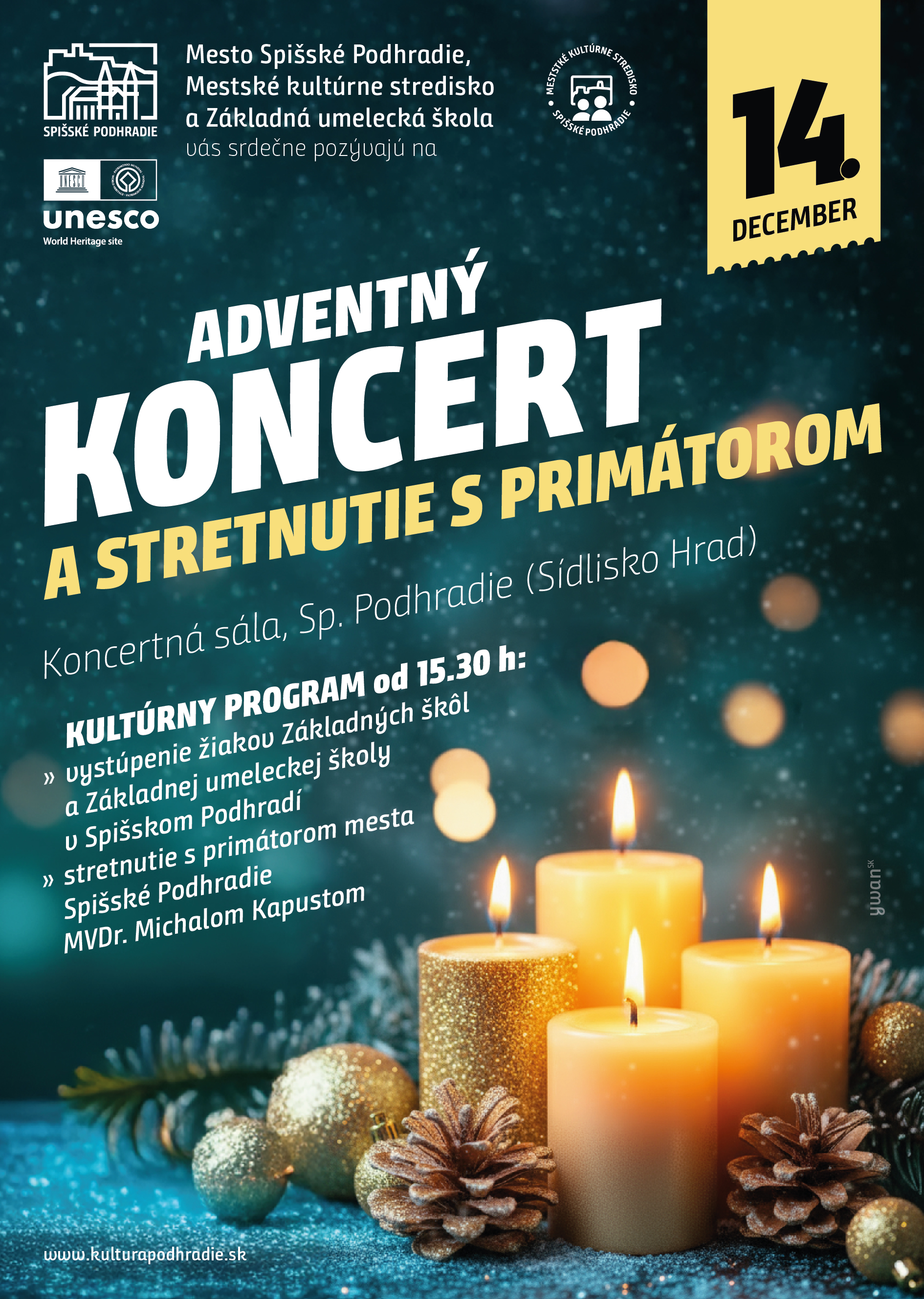 Srdečne Vás pozývame na podujatie "ADVENTNÝ KONCERT A STRETNUTIE S PRIMÁTOROM", ktoré sa uskutoční 14.12.2025 (nedeľa) o 15:30 hod. v Koncertnej sále v Spišskom Podhradí.
