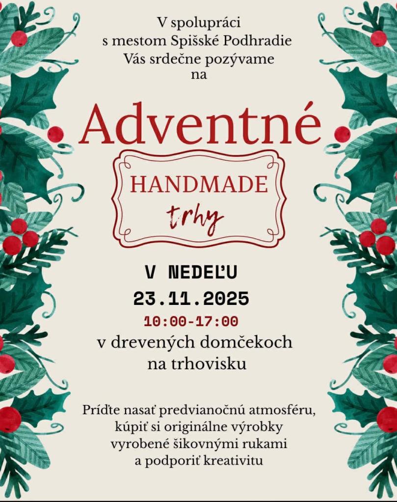 Srdečne Vás pozývame na "Adventné handmade trhy", ktoré sa uskutočnia dňa 23.11.2025 v čase od 10:00 do 17:00 hod. v Parku kultúry za Mestským úradom.