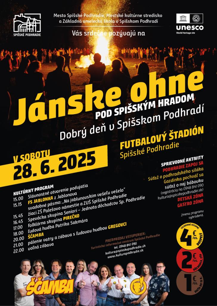 Srdečne Vás pozývame na kultúrne podujatie "JÁNSKE OHNE POD SPIŠSKÝM HRADOM", ktoré sa uskutoční 28. júna 2025 na futbalovom štadióne v Spišskom Podhradí.