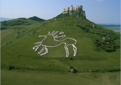 On the north slope of the Spis Castle is a geoglyph of a stylized Celtic horse from the coin found in the Spis Castle. The geoglyph is a picture or a pictograph on land depicting a figure or an ornament. It is a structure of an enormous size. Andrew Roger, the author of this geoglyph, is an Australian artist and sculptor who implements geoglyphs of the present time all over the world. The geoglyph next to the Spis Castle was his first European piece of work. It was implemented as a part of a Rhythm of Life series. Being 100 m wide and 70 m long, this geoglyph was put together from loosely placed travertine boulders. 3000 tones of travertine were used; the construction took two weeks and approximately 140 workers worked on it. The total value of the travertine used for the construction of the Celtic Horse reached 330 000 €.